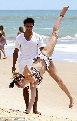 The 31-year-old demonstrated her gymnastic abilities while on the beach in Bahia, Brazil to the obvious delight of fellow beachgoers and the men teaching her how to dance.